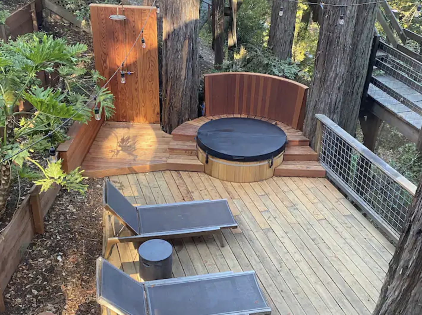 With a hot tub nestled into soaring old growth redwoods, it's like visiting an exclusive hot spring in the woods! It feels like a magical and private oasis miles away from it all, yet central to the best shops and restaurants Marin has to offer.
